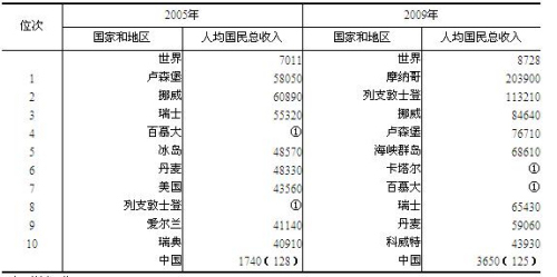2005年和2009年中國與世界前十位國家和地區(qū)人均國民總收入比較 單位:美元 注:①無數(shù)據(jù),近似排位。 來源:國家統(tǒng)計局網(wǎng)站