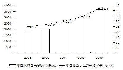 2005-2009年中國人均GNI及相當于世界平均水平的比例