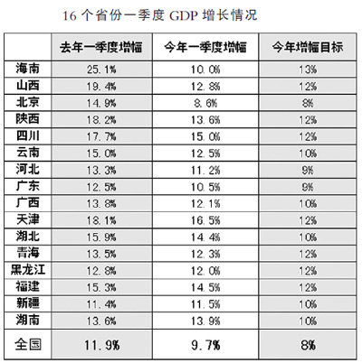 目前,各地一季度經濟運行初步核算數據陸續(xù)公布。從已公布的16個省份GDP同比增長速度看,除湖南和新疆兩地GDP增幅略高于去年同期外,其余14個省份均低于去年一季度增幅。
