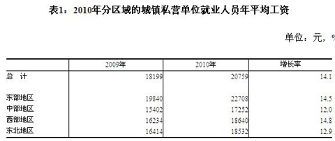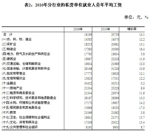 統(tǒng)計(jì)局日前公布了2010年城鎮(zhèn)私營單位就業(yè)人員年平均工資統(tǒng)計(jì)數(shù)據(jù)。數(shù)據(jù)顯示,2010年全國城鎮(zhèn)私營單位就業(yè)人員年平均工資為20759元,與2009年的18199元相比,增加了2560元,同比增長(zhǎng)14.1%,增幅提高7.5個(gè)百分點(diǎn)。私營單位就業(yè)人員年平均工資低于城鎮(zhèn)非私營單位在崗職工平均工資,但增長(zhǎng)速度高于非私營單位0.6個(gè)百分點(diǎn)。