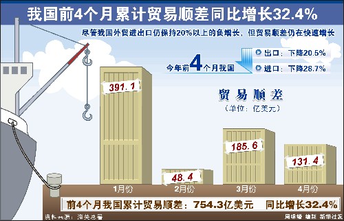 圖表:我國(guó)前4個(gè)月累計(jì)貿(mào)易順差同比增長(zhǎng)32.4% 新華社發(fā)