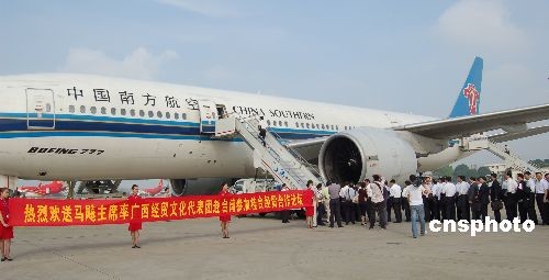 5月21日上午,廣西壯族自治區(qū)主席馬飚率領(lǐng)廣西經(jīng)貿(mào)文化代表團(tuán)乘坐包機(jī)從廣西南寧機(jī)場(chǎng)起飛,開(kāi)始飛赴臺(tái)灣,廣西由此成為中國(guó)大陸各省、自治區(qū)、直轄市中第一個(gè)由省長(zhǎng)級(jí)官員率團(tuán)赴臺(tái)進(jìn)行經(jīng)貿(mào)文化交流的省份,此行也成為海峽兩岸交流史上的新突破。馬飚率團(tuán)此行赴臺(tái)是參加“兩岸產(chǎn)業(yè)高峰會(huì)議——2009年桂臺(tái)經(jīng)貿(mào)合作論壇”,廣西經(jīng)貿(mào)文化代表團(tuán)人數(shù)多達(dá)1000余人,這也是大陸赴臺(tái)人數(shù)最多的參訪團(tuán)。 中新社發(fā) 劉萬(wàn)強(qiáng) 攝