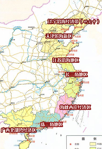 值得指出的是,在這些區(qū)域規(guī)劃中,天津?yàn)I海新區(qū)、江蘇沿海地區(qū)、海峽西岸經(jīng)濟(jì)區(qū)、廣西北部灣經(jīng)濟(jì)區(qū)等,均是改革開(kāi)放以來(lái)沿海地區(qū)發(fā)展中的薄弱環(huán)節(jié),屬于新的戰(zhàn)略部署;而作為中國(guó)經(jīng)濟(jì)最活躍的兩大沿海板塊——長(zhǎng)三角和珠三角,則是再次被重新部署,賦予其全新的發(fā)展詮釋。