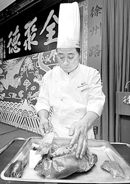這幾天,臺灣饕客們可過足癮了,芥末鴨掌排成的火炬、烏參變成龍舟身、水晶鴨舌模仿成水立方……6月30日開始,北京全聚德在臺舉辦美食節(jié),除了皮肥肉嫩的烤鴨,還帶來了2008年北京奧運(yùn)特色餐點(diǎn)。11位技術(shù)人員親自為島內(nèi)民眾獻(xiàn)技,師傅現(xiàn)場表演片鴨時(shí),1.6公斤左右的烤鴨,連皮帶肉一口氣片出90多片,引來臺下陣陣叫好。