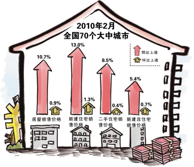 3月10日,國(guó)家統(tǒng)計(jì)局公布的數(shù)據(jù)顯示,2月份70個(gè)大中城市房屋銷售價(jià)格同比上漲10.7%,漲幅比1月份擴(kuò)大1.2個(gè)百分點(diǎn)。但以環(huán)比角度分析則略有改觀。2月份70個(gè)大中城市房?jī)r(jià)環(huán)比上漲0.9%,與去年12月和今年1月相比,分別收窄了0.6和0.4個(gè)百分點(diǎn)。