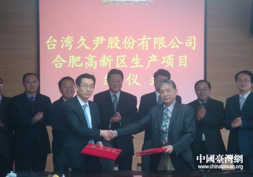 中國臺灣網4月25日合肥消息 日前,臺灣久尹股份有限公司合肥高新區(qū)生產項目正式簽約。市臺辦主任徐延安、高新區(qū)管委會副主任王連貴等出席簽約儀式。