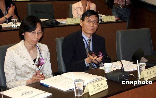 由臺(tái)灣金融研究發(fā)展基金會(huì)、中華經(jīng)濟(jì)研究院與中國(guó)金融學(xué)會(huì)合辦的“第十三屆兩岸金融學(xué)術(shù)研討會(huì)”十六日在臺(tái)北開(kāi)幕,兩岸金融界高層官員會(huì)聚一堂。中國(guó)國(guó)際金融公司總裁兼執(zhí)行長(zhǎng)朱云來(lái)(右)、中國(guó)人民保險(xiǎn)集團(tuán)公司副總經(jīng)理莊超英(左)專(zhuān)程從北京到臺(tái)北出席會(huì)議。 中新社發(fā) 耿軍 攝
