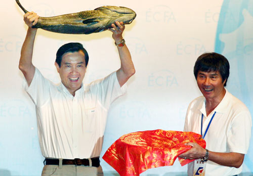 馬英九昨天到高雄市出席“兩岸經(jīng)濟(jì)合作架構(gòu)協(xié)議(ECFA)座談會(huì)”,與養(yǎng)殖、鋼鐵等業(yè)界座談。業(yè)者都非常感謝臺(tái)當(dāng)局簽訂ECFA,讓業(yè)界獲益良多。受益的業(yè)者甚至提來一堆秋刀魚、石斑送給馬英九,讓現(xiàn)場(chǎng)響起熱烈掌聲。