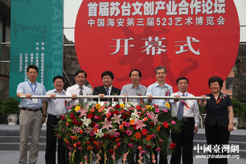 中國臺灣網(wǎng)6月6日南通消息 首屆蘇臺文創(chuàng)產(chǎn)業(yè)合作論壇暨中國海安第三屆523藝術(shù)博覽會6日上午在江蘇省海安縣隆重開幕,來自海峽兩岸及海內(nèi)外的近千位嘉賓歡聚一堂,共同探討加強(qiáng)蘇臺文化交流,促進(jìn)兩岸文創(chuàng)產(chǎn)業(yè)合作。國臺辦主任助理龍明彪、信息中心主任仇開明,文化部文化產(chǎn)業(yè)司司長劉玉珠,江蘇省臺辦副主任石細(xì)云,南通市委書記丁大衛(wèi)等出席開幕式。