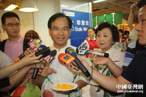 蘇煥智夫婦熱心當(dāng)起推銷員,向到場市民介紹并現(xiàn)場贈送芒果。(中國臺灣網(wǎng) 李學(xué)斌 攝)