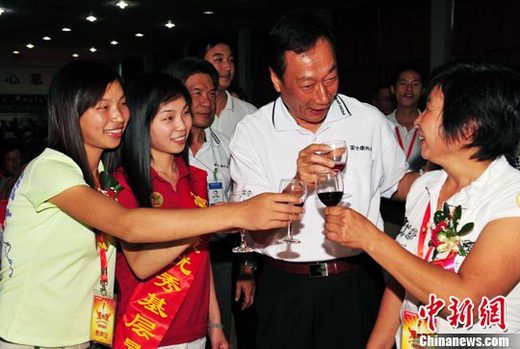 10月16日中午,富士康科技集團(tuán)總裁郭臺(tái)銘在深圳宴請(qǐng)140名優(yōu)秀基層員工家屬,并邀優(yōu)秀基層員工于寧寧(左二)的雙胞胎妹妹加入富士康工作。 中新社發(fā) 陳文 攝