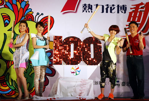 臺(tái)北市長(zhǎng)郝龍斌(前右2)與親善大使S.H.E(前右至左2)帶領(lǐng)百人跳舞,歡慶倒數(shù)100天。