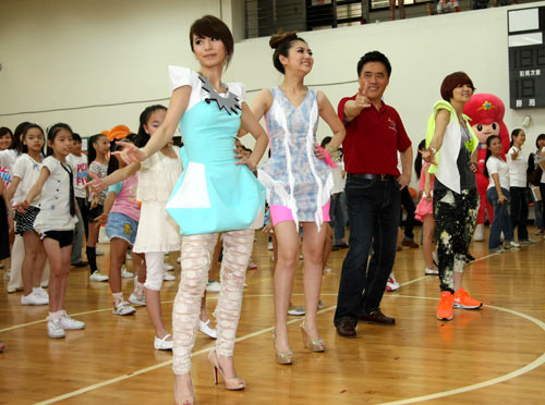 “花博倒數(shù)100天百人齊跳花博舞”記者會(huì)29日在北市中正運(yùn)動(dòng)中心舉行,臺(tái)北市長(zhǎng)郝龍斌(右)與親善大使S.H.E(左3位)揮舞球棒,預(yù);ú┠茼樌M(jìn)行。S.H.E還將歌曲“SHERO”改編成舞曲版,帶領(lǐng)現(xiàn)場(chǎng)人員大跳簡(jiǎn)單易學(xué)的“花博舞”。