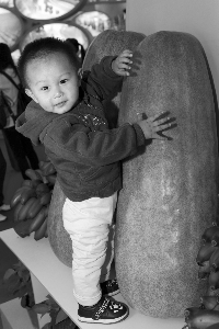 在現(xiàn)代農(nóng)業(yè)“五新”展區(qū),一位來(lái)自華安縣的小孩正在與一個(gè)巨型冬瓜比比看誰(shuí)高。 常剛 攝