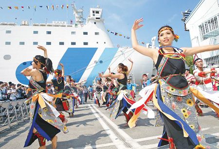 大陸客貨兩用輪“中遠(yuǎn)之星”10日首航高雄港,現(xiàn)場邀請原住民舞蹈團(tuán)迎賓。圖片來源:臺灣《中國時報》