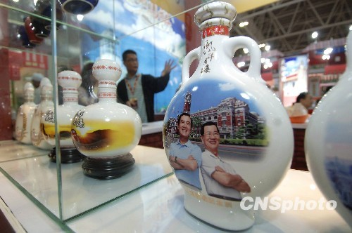5月18日,貼有馬英九、蕭萬(wàn)長(zhǎng)肖像的臺(tái)灣白酒亮相第十二屆海交會(huì)。當(dāng)日,由國(guó)臺(tái)辦、中國(guó)貿(mào)促會(huì)、海關(guān)總署、國(guó)家質(zhì)檢總局和福建省政府共同主辦的第十二屆海峽兩岸經(jīng)貿(mào)交易會(huì)、第七屆中國(guó)福建商品交易會(huì)在新落成的福州海峽國(guó)際會(huì)展中心開幕,近萬(wàn)名海內(nèi)外客商赴會(huì)。 中新社發(fā) 王東明 攝