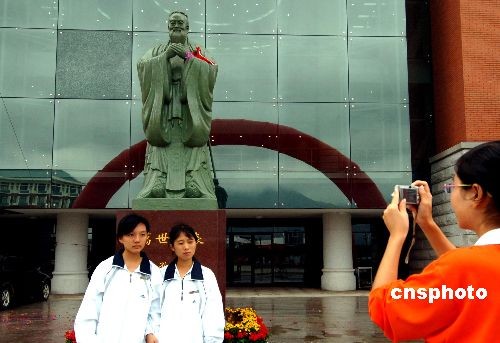 資料圖:二零零八年十一月八日,由著名雕塑家陳一帆雕塑的孔子塑像在福建中醫(yī)學院福州旗山校區(qū)落成。當日,福建中醫(yī)學院建校五十周年慶祝大會在福州旗山校區(qū)隆重舉行。來自海內外的福建中醫(yī)學院校友、來賓及在校師生六千多人出席該學院建校五十周年慶祝大會。 中新社發(fā) 劉可耕 攝