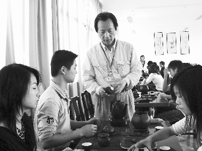 蔡榮章(左三)在指導(dǎo)學(xué)生學(xué)習(xí)如何泡茶,研究茶經(jīng)。