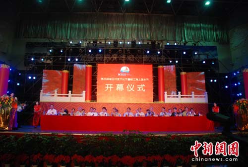 16日晚,第四屆閩臺對渡文化節(jié)暨蚶江海上潑水節(jié)開幕式在福建石獅市體育館舉行。本屆海上潑水節(jié)因天氣原因取消了所有的水上活動。郭斌 攝