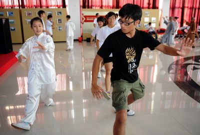 7月5日,臺(tái)灣慈濟(jì)大學(xué)學(xué)生謝詠霖(右)在"中醫(yī)藥傳統(tǒng)文化研習(xí)營"開營式上學(xué)習(xí)太極拳。