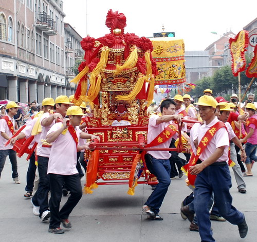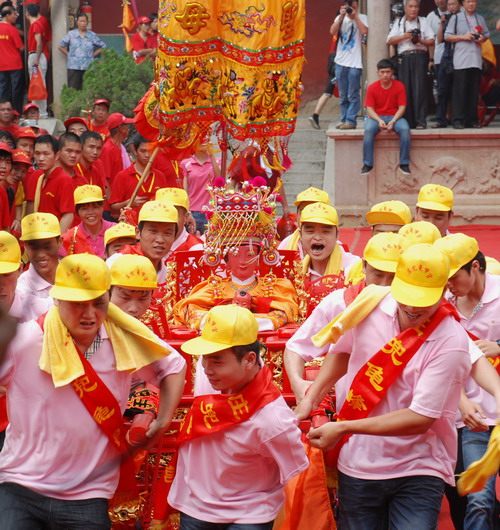 當(dāng)日,福建泉州舉行“2010溫陵媽祖會”祈福祭祀活動,兩岸信眾匯聚泉州參加在此舉行的媽祖巡安踩街民俗活動及大型仿古祭祀儀典。新華社發(fā)(顏財斌 攝)