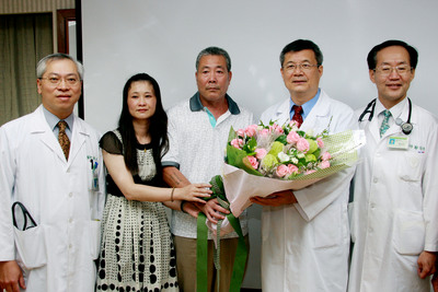 福建泉州男子施純炳(中)因罹患心臟疾病,在臺南奇美醫(yī)院進行手術,成為臺南地區(qū)首例赴臺就醫(yī)的大陸人士。2日他與女兒(左2)一起向主治醫(yī)師致謝。圖片來源:臺灣“中央社”