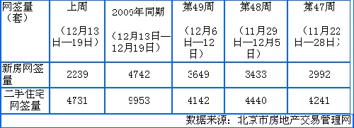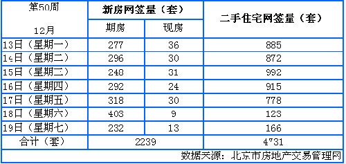 根據(jù)北京市房地產(chǎn)交易管理網(wǎng)及偉業(yè)我愛(ài)我家的統(tǒng)計(jì)數(shù)據(jù)信息顯示:上周(12月13日—19日),全市新建商品房網(wǎng)簽總量為2239套,環(huán)比前一周的3649套,大幅下跌38.6%,與去年同期的4742套相比差距達(dá)52.8%。全市二手住宅網(wǎng)簽總量為4731套,雖與去年同期相比下跌了52%,但是環(huán)比前一周的4142套則上漲了14.2%,日均成交量達(dá)675.9套,創(chuàng)4月底北京樓市新政出臺(tái)以來(lái)的交易量新高。