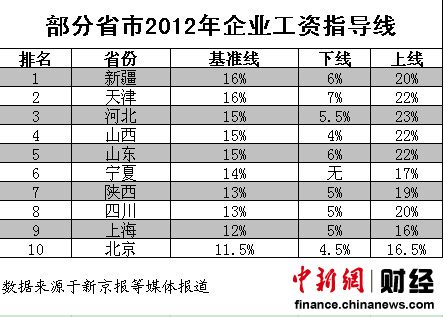 10省市2012年企業(yè)工資指導(dǎo)線一覽