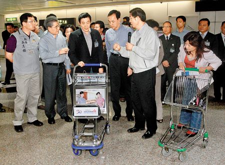 身為臺(tái)灣門面的桃園國(guó)際機(jī)場(chǎng),民怨第一名竟然是小小的行李手推車,馬英九6日巡視機(jī)場(chǎng)時(shí),特別試試新的手推車。圖片來(lái)源:中國(guó)時(shí)報(bào)