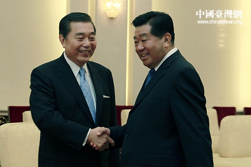 中共中央政治局常委、全國政協(xié)主席賈慶林與臺灣世貿(mào)中心董事長王志剛親切握手。(中國臺灣網(wǎng) 陳佳慧 攝)