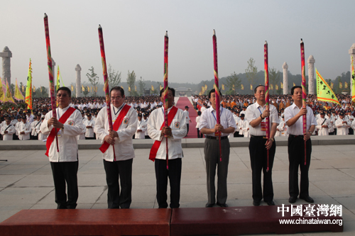 兩岸主祭人國(guó)臺(tái)辦交流局局長(zhǎng)李維一、臺(tái)灣“中華神農(nóng)大帝協(xié)進(jìn)會(huì)”理事長(zhǎng)陳福財(cái)?shù)裙簿锤呦悖ㄖ袊?guó)臺(tái)灣網(wǎng) 趙輝 攝)