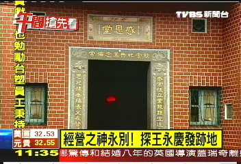 臺灣“經(jīng)營之神”王永慶今天去世。臺灣TVBS報道說,白手起家的他,當(dāng)年就是從新店直潭發(fā)跡,祖厝“感恩堂”還保留著當(dāng)年三合院的格局,盡管不是出身大戶人家,不過外頭有一道龍形圍墻,王永慶日后確實也像這龍一樣事業(yè)飛黃騰達。
