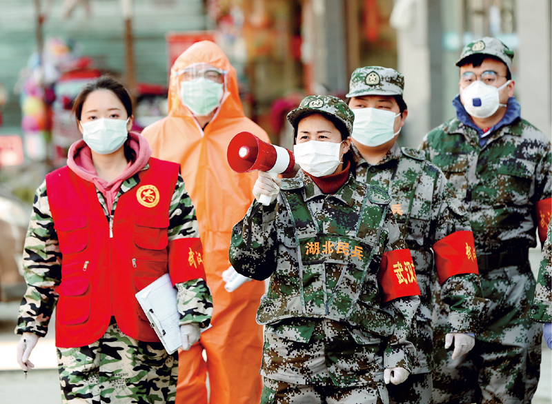 疫情防控阻擊戰(zhàn)打響后,湖北省武漢市江岸區(qū)人武部每天組織300多名民兵24小時(shí)值守在全區(qū)17個(gè)街道52個(gè)疫情防控值勤點(diǎn)崗位,宣傳新冠肺炎疫情防控、測(cè)量體溫、排查登記居民信息,為居民送菜代購(gòu)生活物資和藥品、為社區(qū)居民守好健康之門(mén),筑起疫情防控的銅墻鐵壁。圖為2020年2月20日,江岸區(qū)人武部組織民兵在后湖南街建設(shè)新村社區(qū)宣傳疫情防控。 湖北日?qǐng)?bào)記者 張鴻/攝