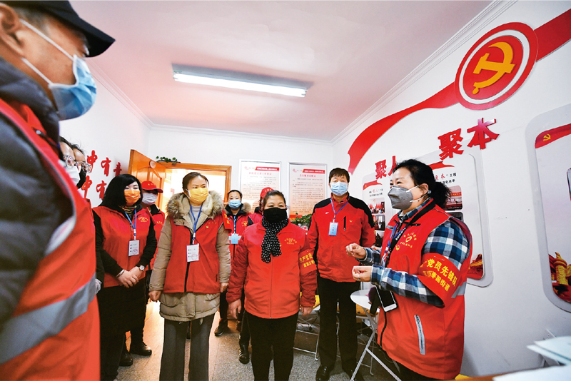 2020年2月11日,陜西省西安市蓮湖區(qū)棗園街道唐都花園社區(qū)黨支部書(shū)記姚美珍(右一)與工作人員和志愿者討論當(dāng)日分工安排。 新華社記者 張博文/攝