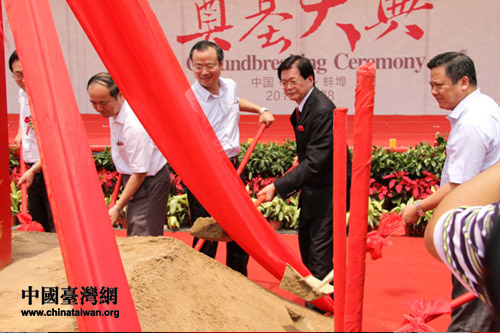 安徽省臺辦主任朱德祥、蚌埠市市長周春雨、上海百樂門董事長趙世崇在儀式上培土奠基(圖片來源:蚌埠市臺辦)