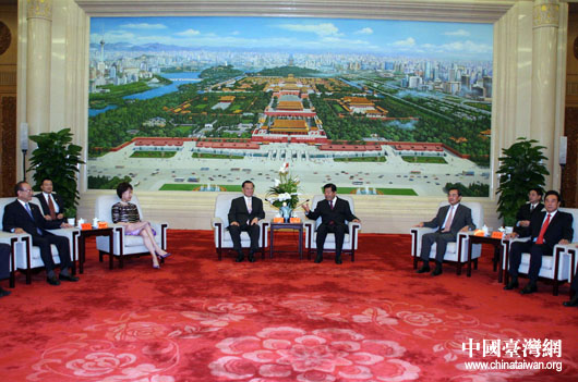 7月27日下午,中共中央政治局常委、全國政協(xié)主席賈慶林在北京人民大會堂北京廳會見了來訪的中國國民黨榮譽主席連戰(zhàn)一行。(中國臺灣網(wǎng) 鐘寶華 攝)
