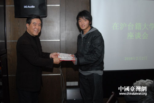 2月2日,2009年上海市臺(tái)聯(lián)獎(jiǎng)學(xué)金獲得者座談會(huì)舉行。會(huì)上,上海市臺(tái)聯(lián)向獲得2009年度上海市臺(tái)聯(lián)獎(jiǎng)學(xué)金的19名在滬臺(tái)籍大學(xué)生頒發(fā)了榮譽(yù)證書(shū)及獎(jiǎng)學(xué)金。(上海市臺(tái)聯(lián) 李從新 攝)