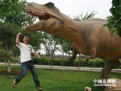夏令營(yíng)的營(yíng)員與恐龍合影(圖片來(lái)源:遼寧省朝陽(yáng)市臺(tái)辦)