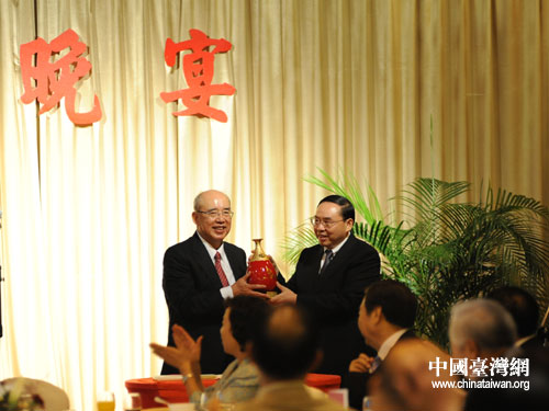 中國國民黨榮譽主席吳伯雄在臺北圓山大飯店會見并宴請中共湖南省委副書記梅克保一行。圖為吳伯雄與梅克;ベ浖o念品。(湖南省臺辦 李蘭 攝)