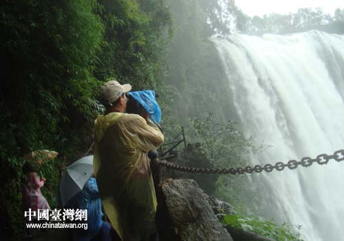 距大瀑布還有數(shù)里之遙,就看到大瀑布沖擊陣陣水霧從峽谷中涌出,伴隨隆隆水聲,記者們已感受到大瀑布的雄壯。有幾位女記者指著水霧漫起的地方,驚呼道:大瀑布在那邊!大家通過(guò)瀑布對(duì)面半山腰的觀光便道向瀑布方向走去,才看到瀑布露出部分就被吸引住了!堵(lián)合報(bào)》記者黃宏璣、《中國(guó)時(shí)報(bào)》記者沈揮勝、《臺(tái)灣新聞網(wǎng)》記者許振澤對(duì)著瀑布不停地舉起相機(jī)、攝像機(jī)。走到瀑布正面,只見藍(lán)色的河水頃刻間變成近百米寬的白色水幕,從數(shù)十米高的懸崖上如萬(wàn)馬奔騰飛馳而下,猛烈地撞擊著谷底深潭,發(fā)出雷鳴般的吼聲,濺起沖天的水霧,情景壯觀極了。半山上風(fēng)大,此時(shí),風(fēng)夾著雨、雨伴著水霧,分不清是雨水還是霧水。驚喜的記者們身著雨衣,忙著給瀑布照相、攝影,忙著與瀑布合影!度碎g福報(bào)》記者林藝斌,是臺(tái)灣著名的360度攝影大師,他到過(guò)黃果樹大瀑布多次了。他曾在安順二十多天,拍攝山水風(fēng)光、民族風(fēng)情,之后,安順臺(tái)辦編輯出版了《安順三百六十度攝影》,在大陸臺(tái)灣受到高度評(píng)價(jià)。林大師感慨道:“太美了,來(lái)了好多次了還是看不夠,到過(guò)黃果樹大瀑布的人,沒(méi)有誰(shuí)說(shuō)不震撼!”