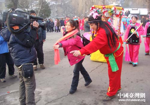 在本溪湖,臺(tái)灣記者們看到了本溪湖的非物資文化遺產(chǎn)《小推車》?吹疆(dāng)?shù)鼐用竦木饰璧副硌荩_(tái)灣中天電視臺(tái)主持人幃幃情不自禁地隨之起舞,并謙虛請(qǐng)教“小車舞”發(fā)明人,與之共舞。(中國臺(tái)灣網(wǎng)本溪市臺(tái)辦通訊員 孫秀國)