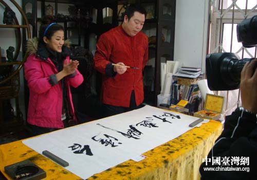 臺(tái)灣記者們專訪了遼硯傳人章永軍,了解了遼硯石材的獨(dú)特優(yōu)點(diǎn),以及遼硯的藝術(shù)觀賞和珍藏價(jià)值遼硯傳人。當(dāng)代著名書法家、工藝美術(shù)大師章永軍還即興揮毫潑墨為節(jié)目組留下“臺(tái)灣腳逛大陸”墨寶贈(zèng)送臺(tái)灣中天電視臺(tái)。(中國臺(tái)灣網(wǎng)本溪市臺(tái)辦通訊員 楊宏石)