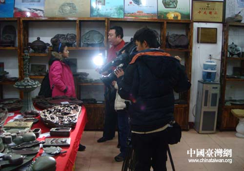 中國臺(tái)灣網(wǎng)12月27日本溪消息 22日,臺(tái)灣中天電視《臺(tái)灣腳逛大陸》節(jié)目組一行四位記來到了遼寧省本溪市遼硯最大的生產(chǎn)基地進(jìn)行采訪。本溪市臺(tái)辦副主任范藝陪同采訪。