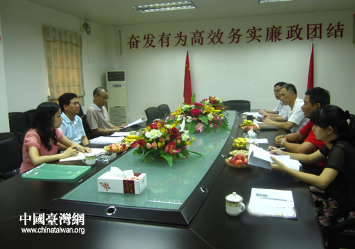 中國(guó)臺(tái)灣網(wǎng)7月19日廣州消息 7月14日至15日,廣東省臺(tái)辦副主任蔣長(zhǎng)芳一行4人到江門市調(diào)研,并與江門市委臺(tái)辦有關(guān)人員進(jìn)行了座談。