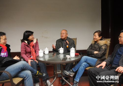四川知名學(xué)者袁庭棟教授(中)向臺(tái)灣中華聯(lián)合青年議事協(xié)會(huì)參訪團(tuán)一行作巴蜀文化講座。(圖片來源:四川省臺(tái)辦)