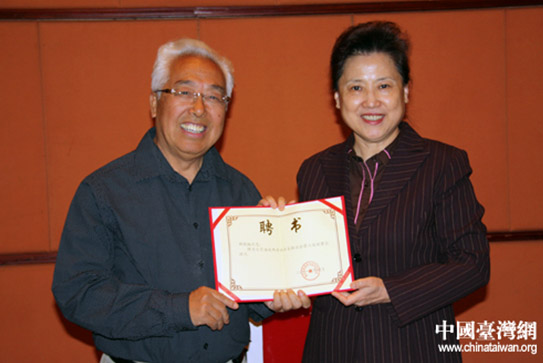 北京市臺辦主任馬玉萍向書畫名家頒發(fā)名譽顧問榮譽證書。
