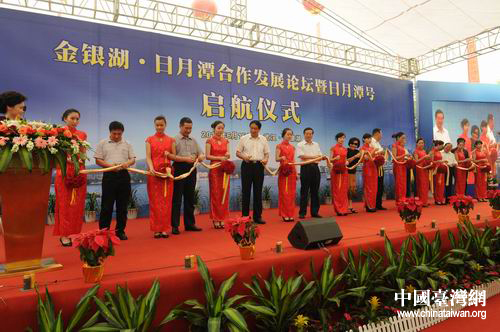 “金銀湖—日月潭合作發(fā)展論壇”暨“日月潭號”游船啟航儀式在武漢舉行,圖為兩岸嘉賓為啟航儀式剪彩。(湖北省臺辦 陸勝 攝)