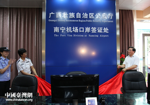 中國臺(tái)灣網(wǎng)6月26日南寧消息 日前,臺(tái)灣居民口岸簽注啟動(dòng)暨廣西壯族自治區(qū)公安廳南寧機(jī)場(chǎng)口岸簽證處揭牌儀式在南寧吳圩國際機(jī)場(chǎng)隆重舉行。廣西壯族自治區(qū)副主席、公安廳黨委書記、廳長(zhǎng)梁勝利,公安部出入境管理局副局長(zhǎng)朱際青等領(lǐng)導(dǎo)出席并致詞。自治區(qū)、南寧市有關(guān)部門領(lǐng)導(dǎo),部分在邕旅行社代表,公安民警代表共250人參加了啟動(dòng)儀式。
