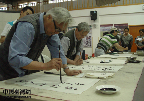 臺屬書畫家在什邡洛水慈濟活動中心寫作詩畫。(德陽市臺辦 甘和林 攝)