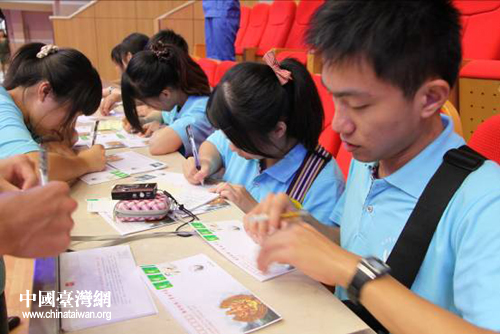 臺灣學(xué)生認(rèn)真寫下對親人的祝福。(圖片來源:河南省臺辦)